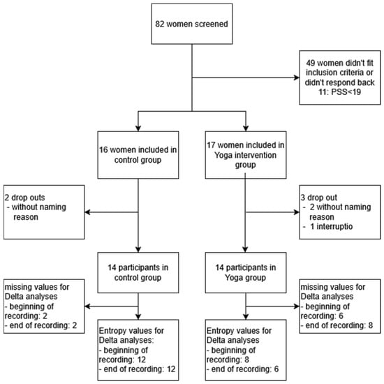 The quasi-randomized controlled trial was performed from December 2022 to May 2024 in Munich, Germany, at the University Hospital of the Technical University of Munich (TUM). For recruitment (Figure 1), we advertised our study on the homepage of TUM University Hospital, as well as in the referring physicians’ centers and the Klinikum Dritter Orden. We screened 82 pregnant women with Cohen’s Perceived Stress Scale (PSS) at 17 (control) vs. 16 (Yoga) weeks of gestation.