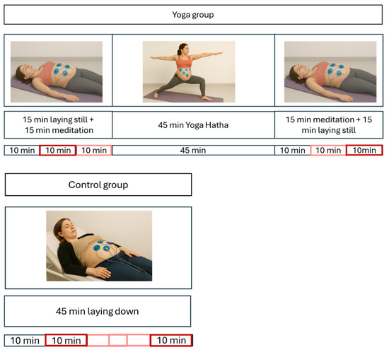 The control group received standard obstetric care. Yoga group participants attended a weekly 75-min Yoga class with elements of Hatha Yoga and a weekly 20-min online Yoga Nidra class with relaxation and mindfulness practice. During the Yoga class and an additional 15 min of lying still before and after the class, we recorded an aECG. Such placement of the ECG was chosen to conform to the standard maternal experience of fHR recording during a non-stress test. The ECG measurement was also performed once a month in the control group for 45 min. The procedure was performed at a similar time as the Yoga class, in the afternoon, to prevent confounding by the circadian rhythmicity of fetal behavioral states [32] and cortisol levels [33]. The recording duration in the control group was shorter than in the Yoga group to ensure participant compliance and maintain the feasibility of the recordings.