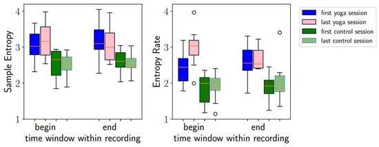 Sample Entropy (SampEn) and Entropy Rate in the second (“begin”) and last (“end”) 10-min time windows are compared between the groups (Yoga vs. control) and during pregnancy. Blue (pink): first (last) session for the Yoga group; green (light green): first (last) session for the control group. At the first session, both entropy biomarkers were already higher in the Yoga group compared to the control group. By the end of the study, the Entropy Rate had further increased in the Yoga group, while it remained stable in the control group. Red straight line in the box plots indicates the median.