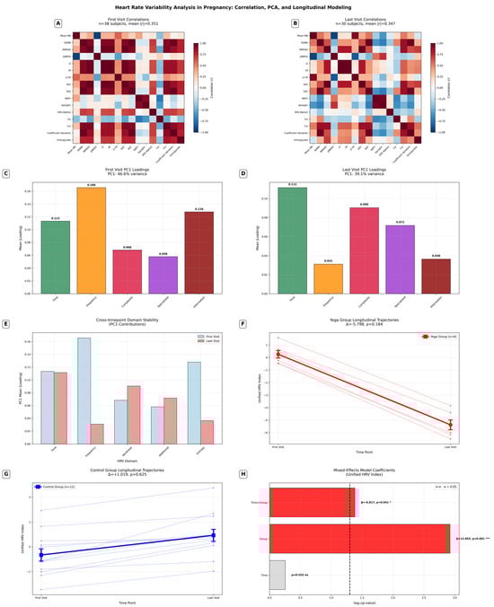Comprehensive HRV analysis in pregnancy: correlation structure, PCA, domain contributions, and longitudinal modeling. (A,B) Correlation matrices of representative HRV metrics at the first visit (A) and last visit (B). Colors indicate correlation coefficients from −1 (blue) to +1 (red). (C,D) Principal component analysis (PCA) loadings for the first principal component (PC1) at the first (C) and last (D) visits. HRV metrics are grouped by physiological domains: Time (green), Frequency (orange), Complexity (red), Specialized (purple), and Information-theoretic (dark red). (E) Cross-timepoint comparison of domain contributions to PC1 between the first and last visits. (F,G) Distribution and longitudinal trajectories of the unified HRV index for the Yoga group (F) and Control group (G). (H) Results of linear mixed-effects models on the unified HRV index, showing standardized coefficients for group, time, and interaction terms.