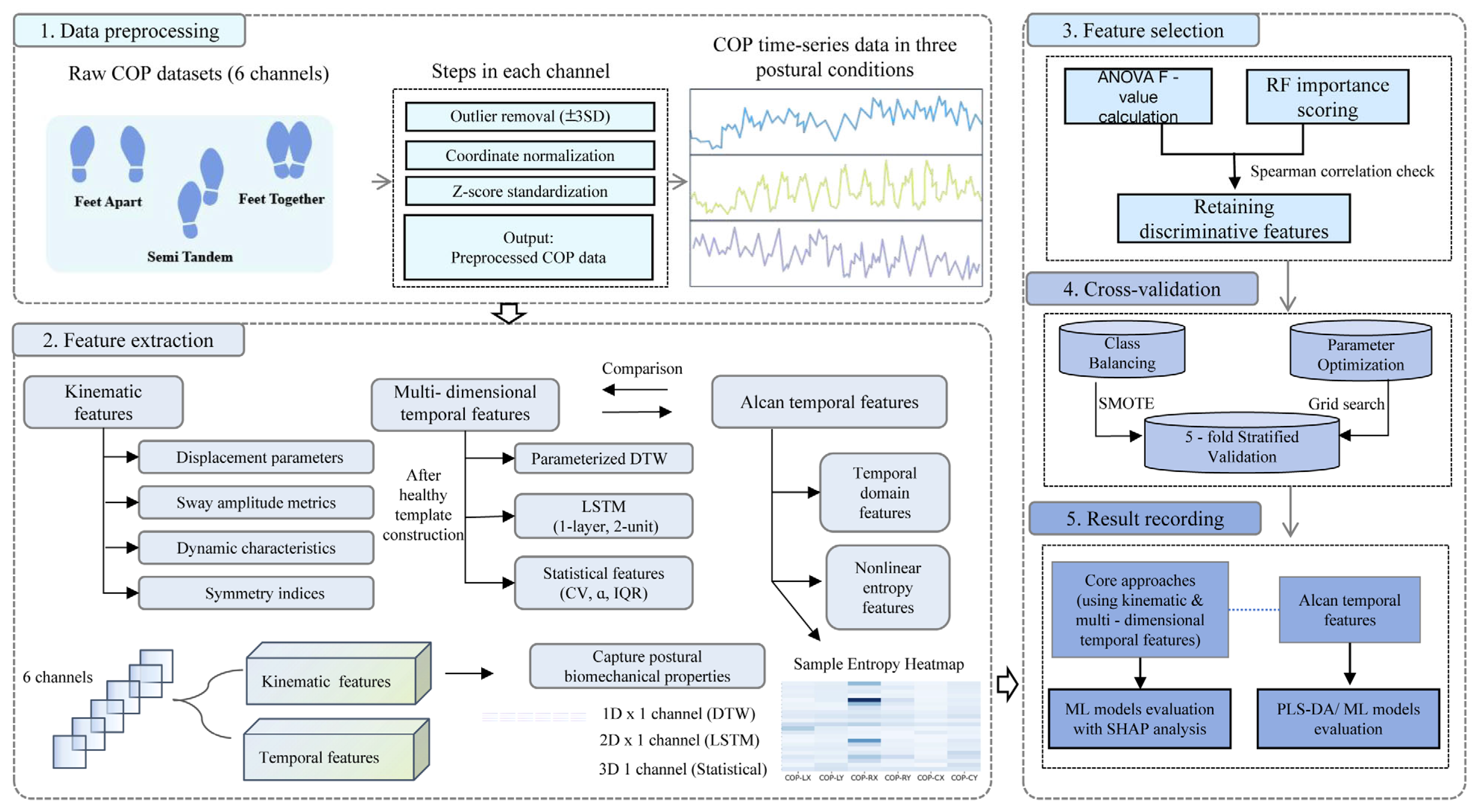 Having established that our cohort reliably distinguishes sarcopenia from non-sarcopenia groups based on AWGS 2019 criteria—a critical prerequisite for validating subsequent analyses—we now detail our core framework: a multidimensional temporal feature-based approach to detect subtle variations in compensatory reserve within the sarcopenia group using COP dynamics. This focus on intra-group differences aligns with our goal of exploring gradations of neuromuscular compensation, which cannot be fully captured by binary group comparisons alone.