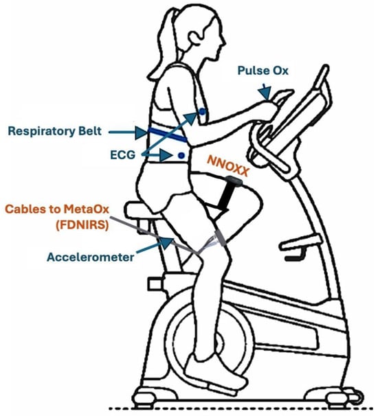 Subject device placement. The FDNIRS device and NNOXX One device were placed on the subject’s rectus femoris, mirroring the position of the other. The NNOXX device was secured to the subject’s leg using a Velcro strap. The FDNIRS device was secured the contralateral leg using adhesive bandages, with the fiber cables lying flat against the leg and out of the way. Additional devices, including an ECG, respiratory belt, fingertip pulse oximeter, and external accelerometer were also placed on the subject as indicated in the image.