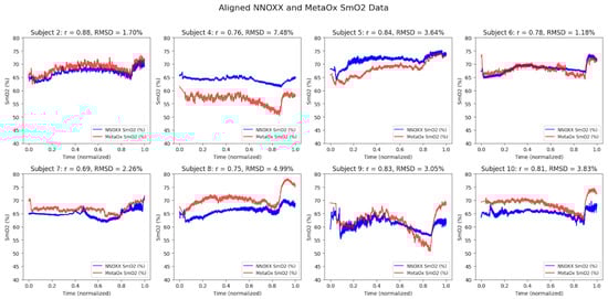 Pairwise comparisons between SmO2 readings for the NNOXX CW-NIRS and MetaOx FD-NIRS devices for all eight subjects included in the analysis. Results indicate strong consistency between devices within subjects. Time series data were temporally aligned by normalizing the time axis from 0.0 to 1.0 for each complete exercise session, then resampling the NNOXX One and MetaOx datasets to the matched time points for paired comparisons, enabling direct comparison between devices with different sampling frequencies. Inter-device correlations within subjects range from r = 0.69 to r = 0.88 as explained by Table 2.