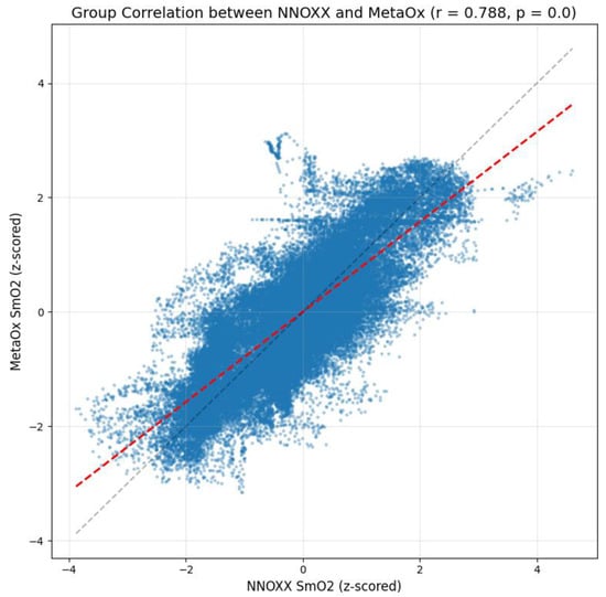 For group-level analysis, we applied Z-score normalization to each subject’s data independently, transforming individual measurements to have a mean of 0 and standard deviation of 1, before pooling data across all subjects. This normalization approach isolates device agreement from inter-individual physiological variability. While both devices measure absolute SmO2 values, individual subjects naturally exhibit different resting (e.g., baseline) SmO2 values and response magnitudes during exercise, in majority due to differences in tissue properties and fitness levels. The devices can then be assessed for tracking relative changes within each individual consistently, rather than being confounded by absolute value differences between subjects, thus focusing the validation on device concordance in detecting physiological patterns. While individual subject correlations provide valuable insights into device agreement on a per-participant basis, comprehensive validation required assessment of overall performance across the entire study population.