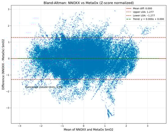 This analysis indicates that 95% of the differences between measurements were expected to fall between −1.28 and 1.28 in normalized units, which corresponds to approximately −8.1% to 7.6% in SmO2 units when converted back to the original scale. This range is notably narrow for physiological measurements, particularly for wearable technology, supporting strong agreement between the devices.