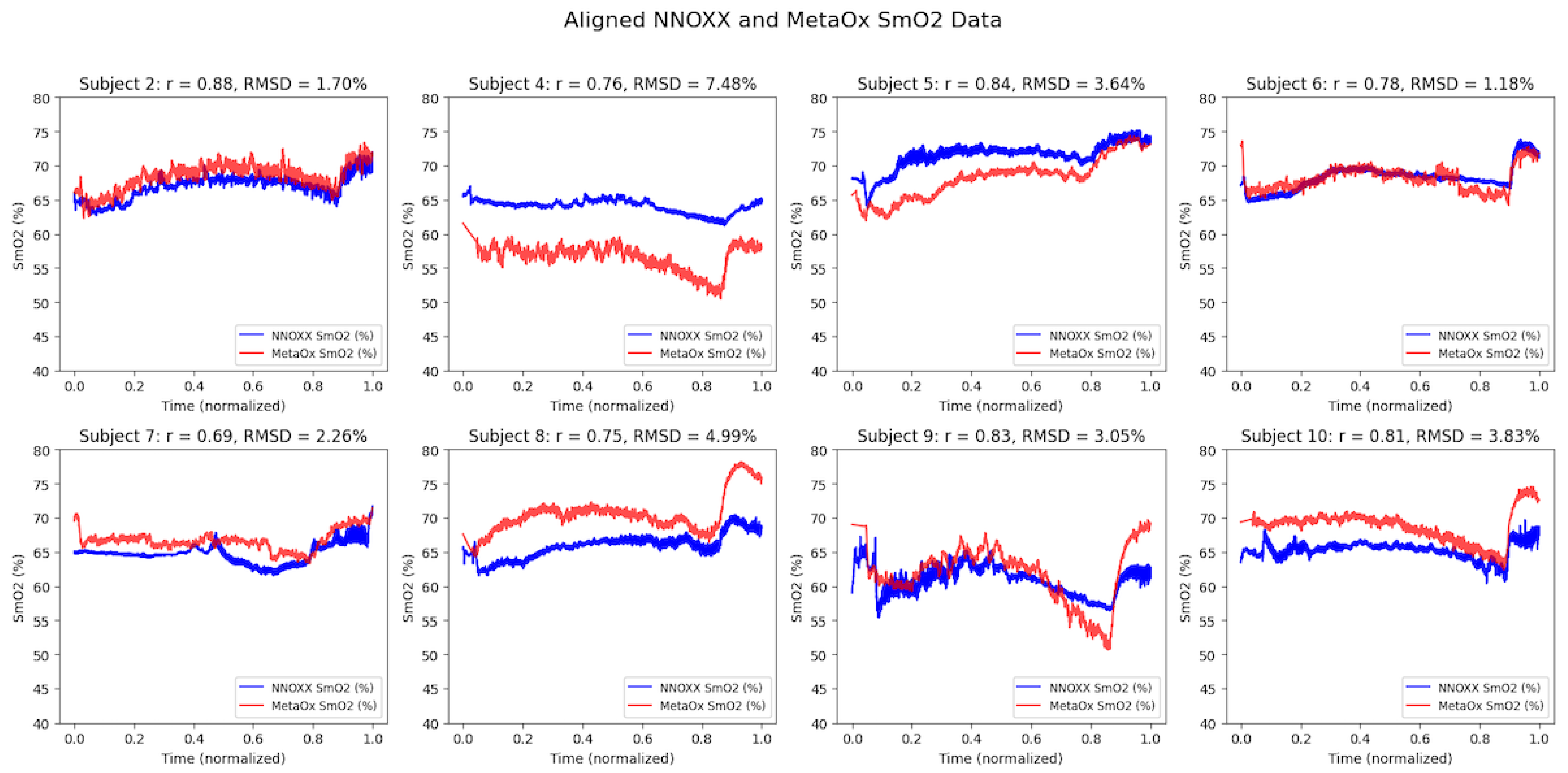 2 measurements strongly correlate with those from the reference standard FDNIRS device. The individual subject correlations indicate that NNOXX One captures the same physiological signals as the reference device, despite differences in technology and limb placement. The RMSD values below 5% for most subjects meet our predefined goal of measuring SmO