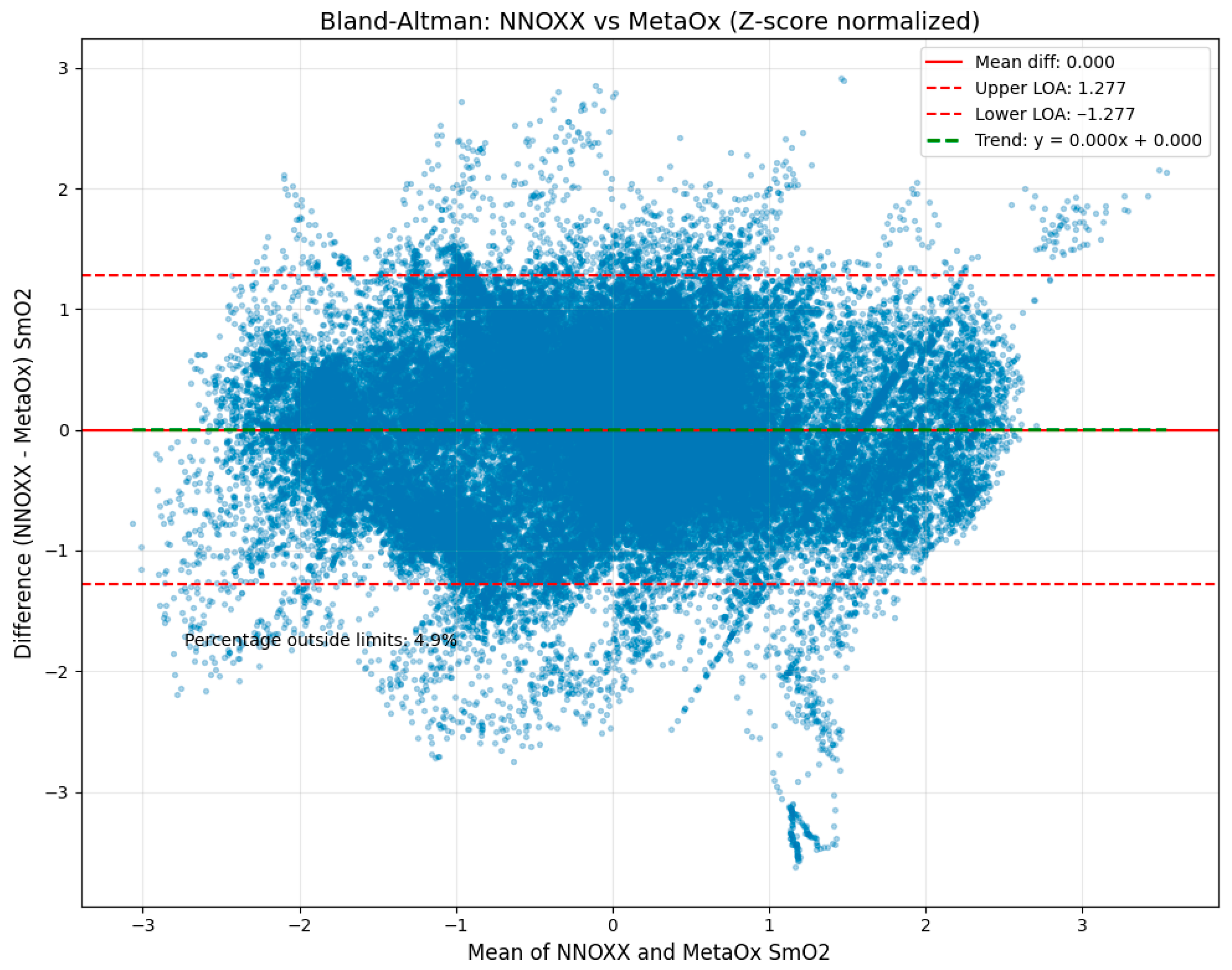 Mean difference (bias): 0.000 (z-scored data). This value represents the average difference between all NNOXX One and FDNIRS measurements. The zero bias indicates that, on average, there is no systematic difference between the two devices, suggesting neither device consistently overestimates or underestimates SmO2 relative to the other.