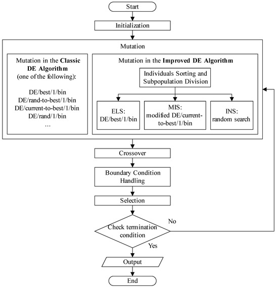 The operational steps of the improved DE algorithm are the same as those of the classic DE algorithm. The primary difference between the improved DE algorithm and the classical DE algorithm lies in the mutation step.