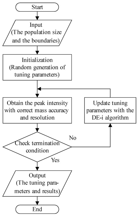 Figure 2 illustrates a schematic diagram of the ion source and ion optics lens parameters of the test platform. The flowchart of the automatic tuning method based on the improved differential evolution algorithm is shown in Figure 3. The algorithm and instrument communicate via text files to exchange tuning parameters and peak intensity results. Operation on the mass spectrometer encompasses calibration of the mass axis and mass resolution, and peak intensity result output. The calibration of the mass axis and resolution is relatively simple and can be achieved through a linear model with theoretical formulas.
