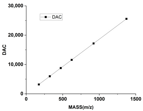 Taking the Q1 mode as an example, the primary parameters involved in the tuning process include gas parameters such as the nebulizer gas (GS1) and curtain gas (CUR), along with voltage parameters like de-clustering voltage (DP), entrance voltage (EP). Parameters like GS1 and CUR, as well as DP and EP, primarily influence the intensity of the mass spectral peak. The mass axis is determined by a series of mass numbers and digital-analog converter (DAC) values that are in a linear relationship. The DAC value corresponds to the magnitudes of both direct voltage and radio-frequency voltage at a specified mass number. DAC impacts the accuracy of the mass axis. The resolution offset voltage (OFFSET) affects the mass resolution. The instrument is factory-set with values of DAC and OFFSET corresponding to a series of mass numbers, which are shown in Figure 4 and Figure 5. Figure 4 illustrates the relationship between mass and DAC for the instrument, and Figure 5 illustrates the relationship between mass and OFFSET.