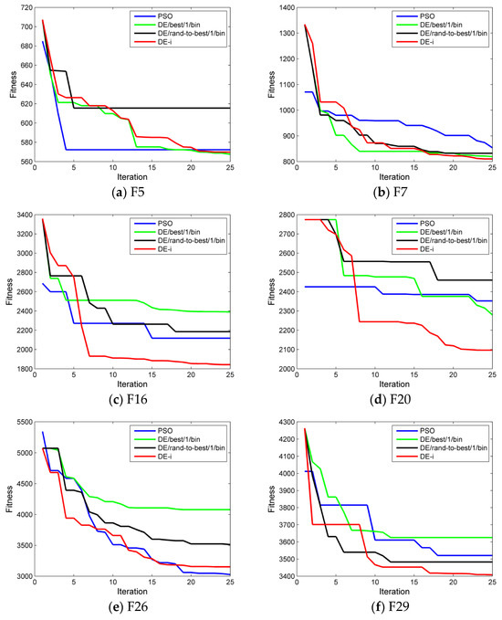 The improved DE algorithm (DE-i) was compared with the classic DE algorithm and the standard particle swarm optimization algorithm (PSO). The classic DE algorithm used two mutation methods: DE/best/1/bin and DE/rand-to-best/1/bin.