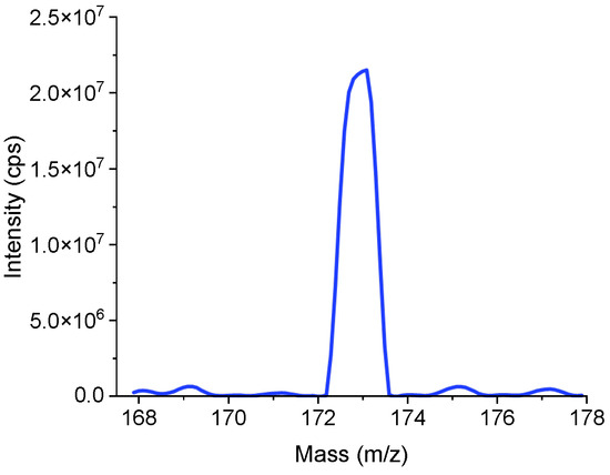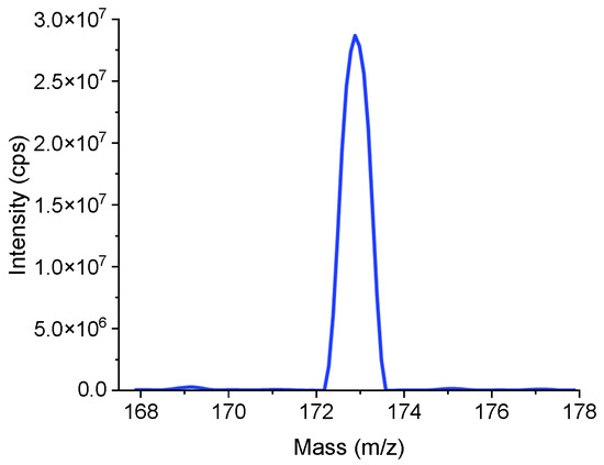 The first method is univariate search. Ten uniformly distributed parameter values are selected within the feasible interval for each parameter. The process took 5 min to obtain the result, including the time for file reading and writing. Final optimal parameter values obtained were: GS1 =20; CUR = 10; DP = 120; EP = 10. The mass spectrum is displayed in Figure 7. The intensity of the m/z 172.88 mass spectral peak is 2.15 × 107 cps. The mass resolution is 0.786 u. Here and in all subsequent mass spectrum, MCA = 5 is adopted.