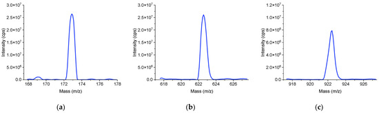 The mass spectrum after the tuning process. (a) m/z 172.88 (intensity: 2.64 × 107 cps; mass resolution: 0.675 u). (b) m/z 622.57 (intensity: 2.61 × 107 cps; mass resolution: 0.709 u). (c) m/z 922.36 (intensity: 7.89 × 106 cps; mass resolution: 0.723 u).
