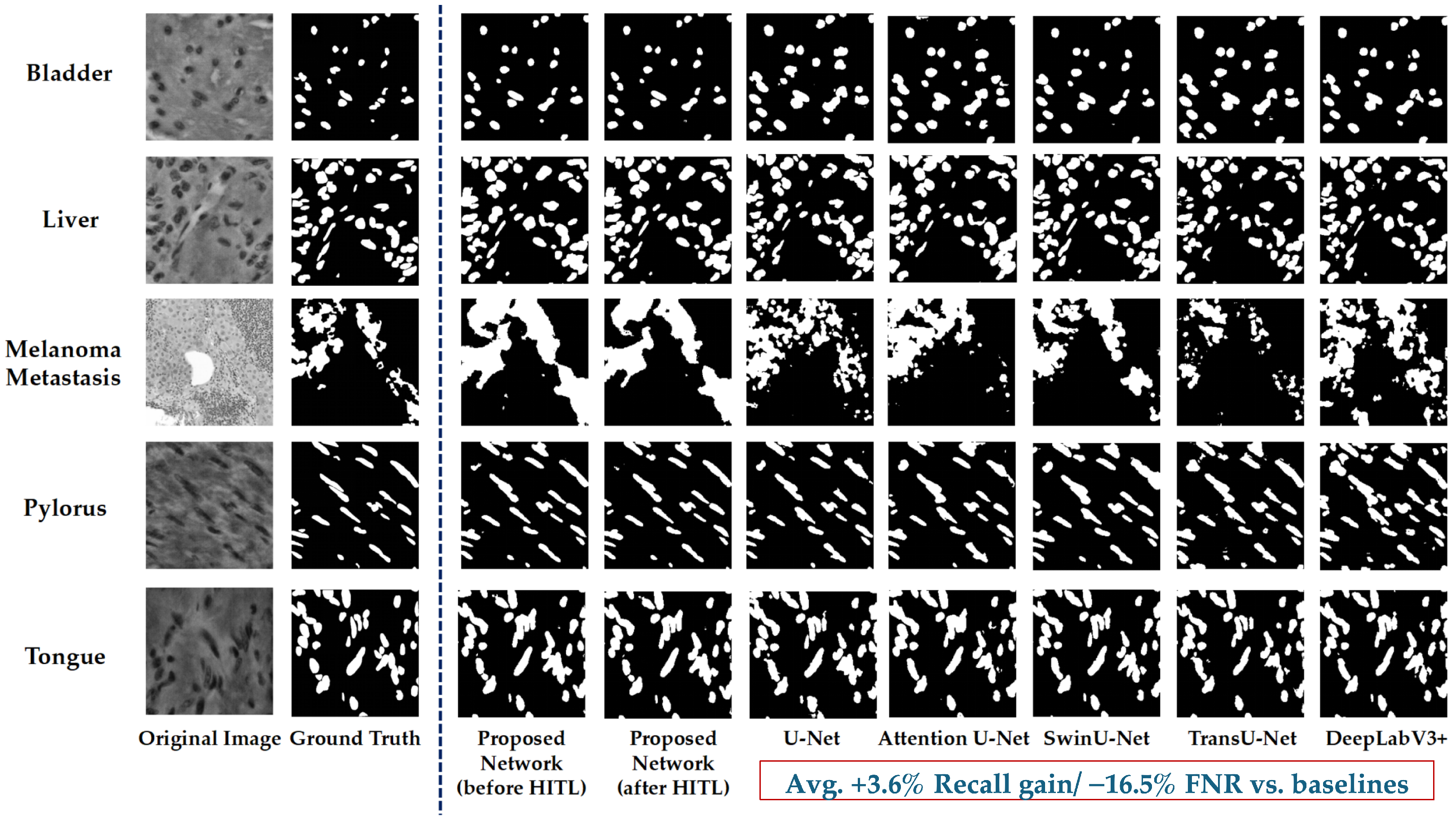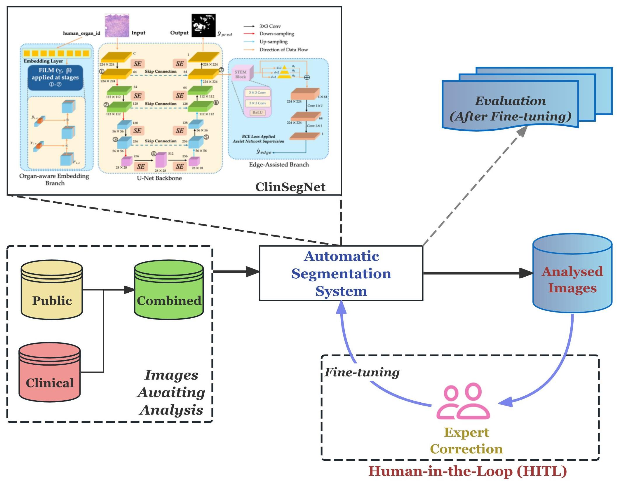 Although the above studies comprehensively demonstrate the potential of HITL framework to improve the safety, interpretability, and efficiency of medical AI systems, there are still some important research limitations. First, most existing works mainly focus on classification tasks or decision support in structured scenes, and pay less attention to pixel-level spatial reasoning tasks such as histopathological image segmentation. However, in the actual pathological diagnosis, the characteristics of image boundaries are fuzzy and the lesion area is small, which puts forward higher accurate positioning and fine-grained learning requirements for the model. Secondly, although interactive correction or active query mechanisms have been introduced in previous studies, many existing systems still rely on fixed labelling protocols or post-hoc feedback mechanisms, and have not yet realized real dynamic collaboration and real-time human–machine co-construction model process. For example, although the CAIPI framework allows for experts to correct model interpretation, its interaction mode is still relatively limited, and it lacks modelling support for contents such as “tissue-specific preference”. At the same time, the existing HITL schemes generally aim at the overall performance optimisation and rarely focus on the more critical optimisation of “high recall” in the clinical process, which is exactly the core index that affects the diagnostic safety in the actual lesion screening.