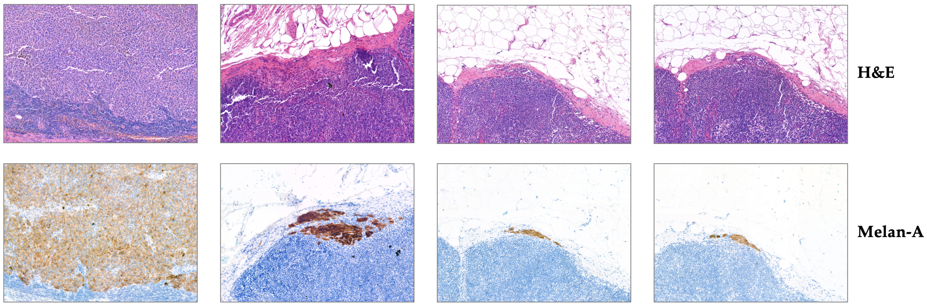 All images are provided in pairs to ensure a one-to-one correspondence between H&E and Melan-A-IHC stained images to facilitate subsequent registration and comparative analysis. H&E staining highlights the general tissue morphology, while Melan-A immunohistochemistry specifically labels melanocytic cells, facilitating the identification of metastatic regions. Representative paired images from the UHS-MelHist dataset are shown in Figure 3, illustrating both H&E and Melan-A staining for the same regions of interest. And Figure 4 highlights an example where the metastatic field is indistinct on H&E, but clearly visible on Melan-A staining.
