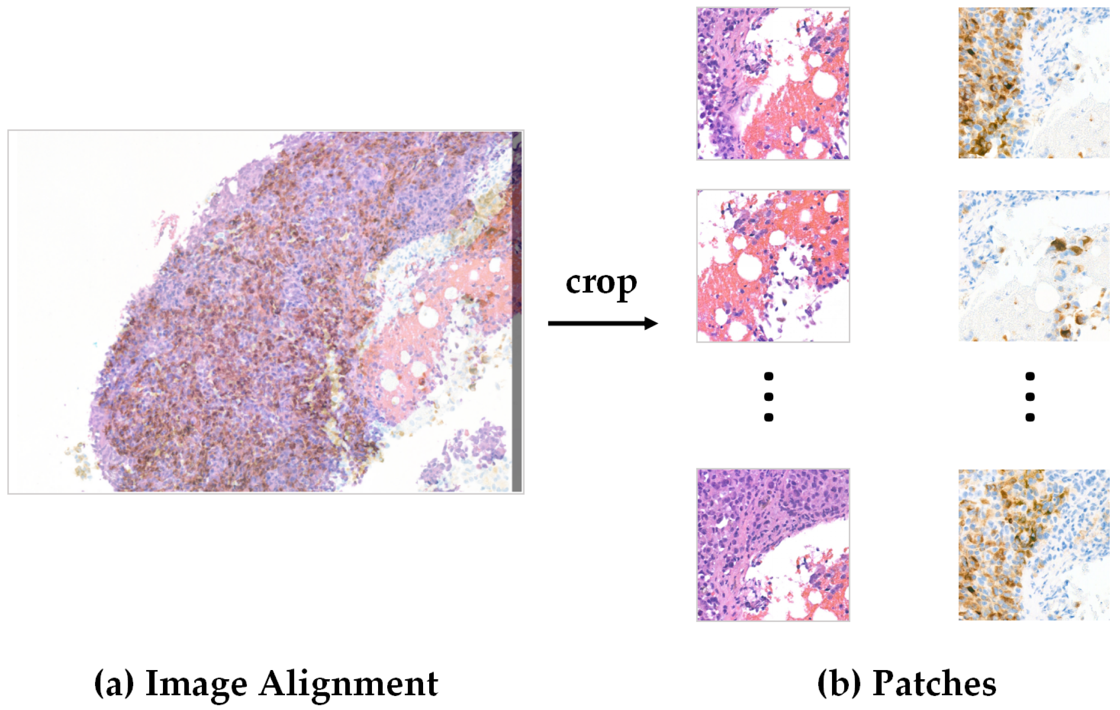 Firstly, the paired H&E and Melan-A images are not perfectly aligned at the original ROI level, so the Melan-A images need to be rotated and translated by manually set parameters during pre-processing to ensure the spatial correspondence with the H&E images. Subsequently, 512 × 512 patches with a step size of 256 pixels were cut in a sliding window fashion within the overlapping region to obtain paired H&E/Melan-A patches, as shown in Figure 6.