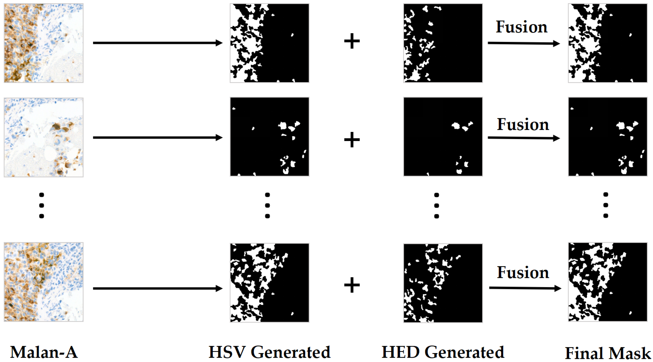 To generate usable segmentation labels from Melan-A images, two complementary mask extraction methods are designed in this study. The first one is based on HSV colour space, uses the hue range to separate the typical DAB yellow-brown signal, and excludes the background blue area. After morphological operation and small area filtering, the preliminary mask is obtained. The second one is based on HED pigment decomposition, which separates DAB channels from Melan-A images, and combines the Gaussian smoothing and Otsu thresholding methods to obtain a refined mask, which is then optimized by opening and closing operations and small-region filling. Finally, the two candidate masks were fused by logical OR (union) to obtain a more robust label. The mask generation procedure is illustrated in Figure 7.