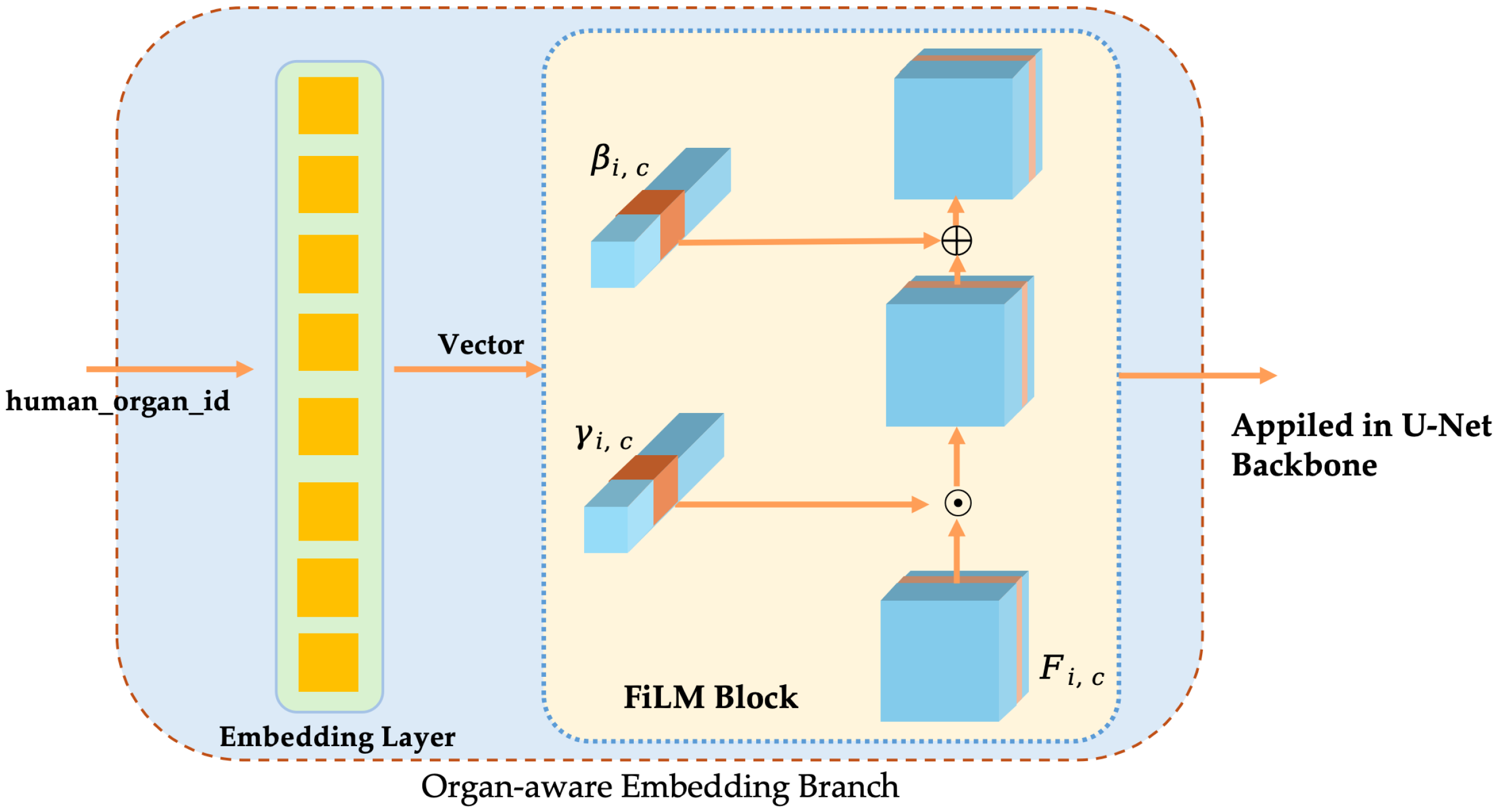 • Organ embedding mechanism: Organ label information was integrated into the model, enabling conditional modulation of different tissues during feature extraction and improving cross-organ generalisation.