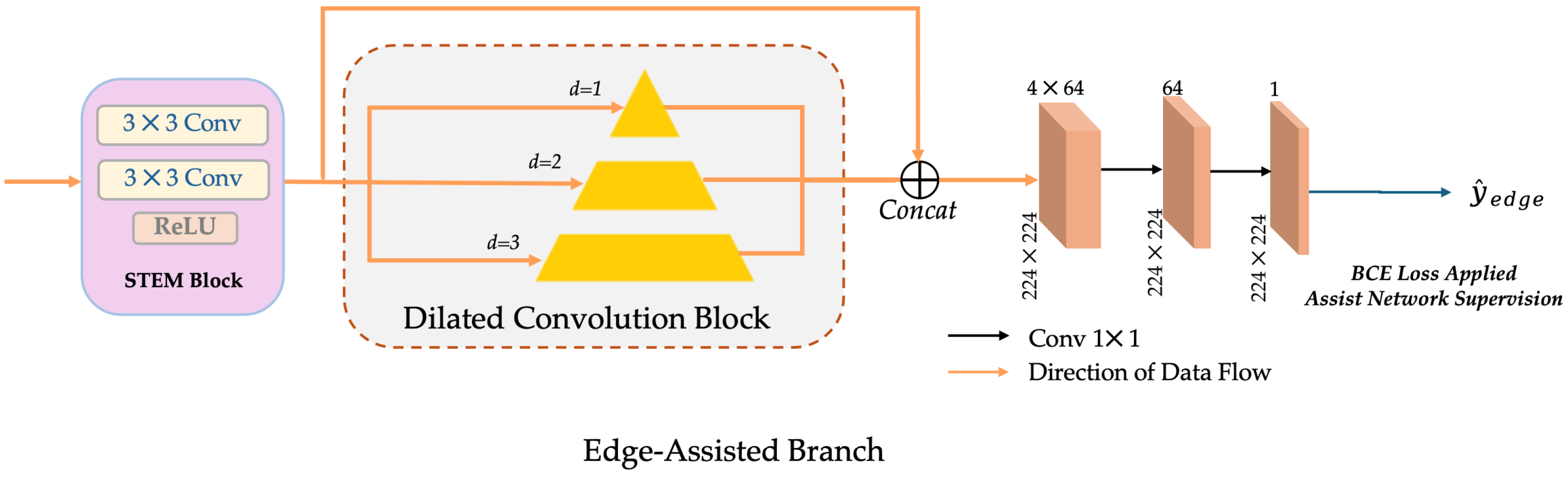 • Edge-assisted branch: Edge supervision was introduced to strengthen boundary localisation, reducing lesion blurring and breakage, and improving contour consistency.