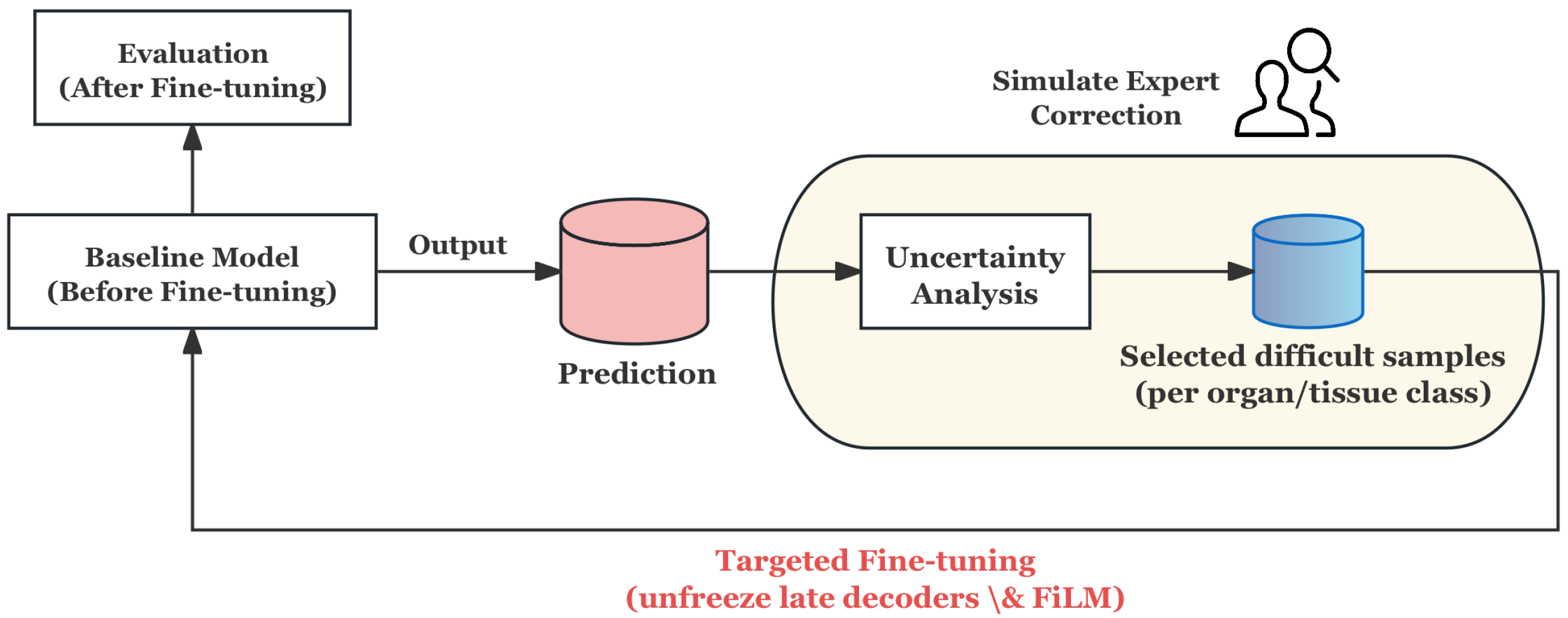 • Expert-guided refinement: An uncertainty-driven Human-in-the-Loop (HITL) strategy was adopted to selectively fine-tune high-uncertainty cases, simulating expert correction in clinical workflows.