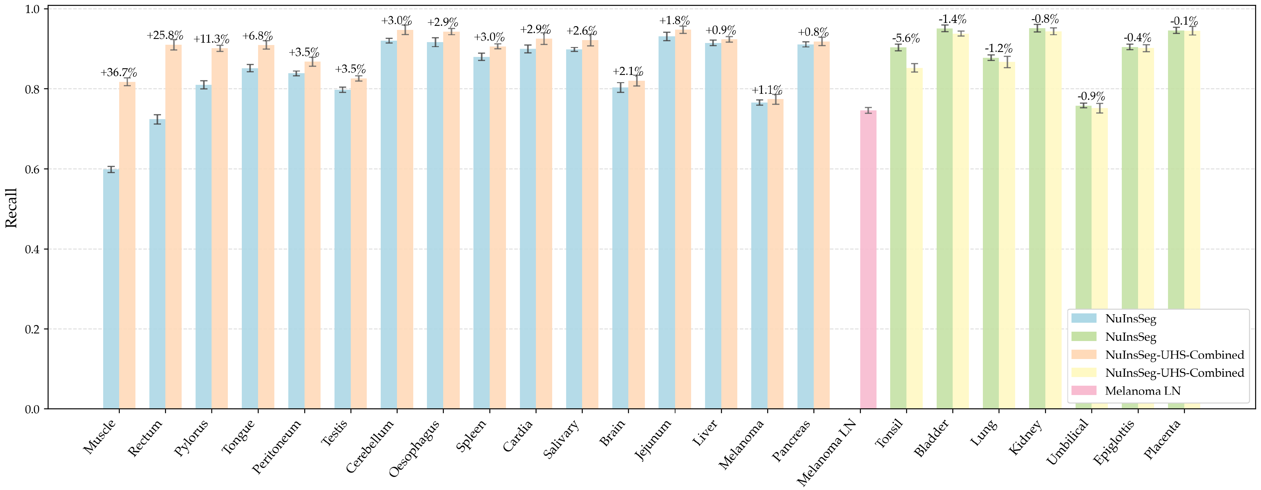 Table 11. Per-organ recall on NuInsSeg and NuInsSeg-UHS-Combined datasets. The results show that recall generally improves after incorporating UHS samples.