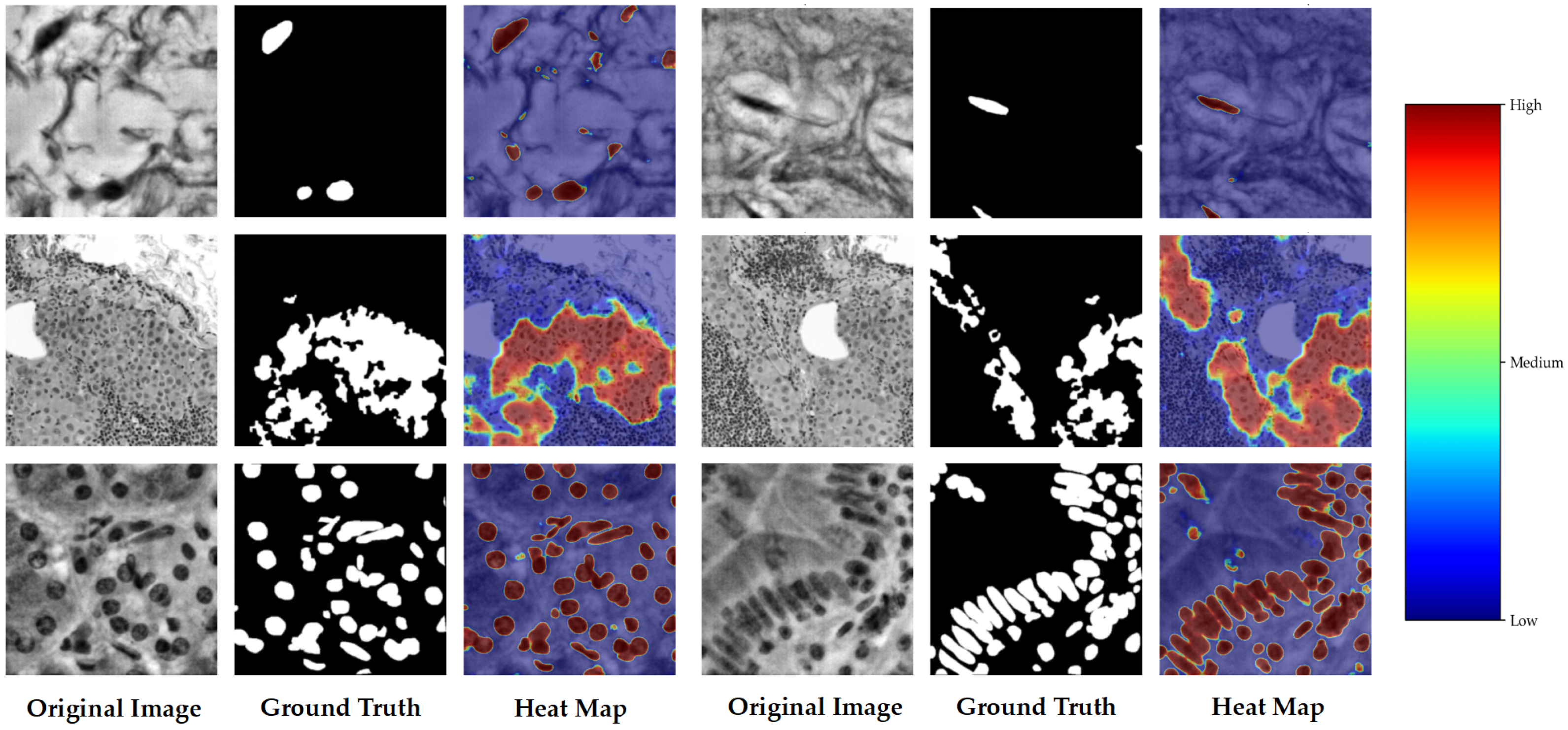 Moreover, recent studies have introduced several Transformer-based architectures tailored for histopathological image segmentation, aiming to capture long-range dependencies beyond the capability of CNNs. SwinCup [37] embeds the Swin Transformer into a cascaded upsampling framework for gland segmentation, enabling hierarchical attention across tissue scales and achieving superior boundary accuracy on the GLAS and CRAG datasets. MTPA-Net [38] employs a multi-scale Transformer with parallel attention modules to enhance contextual learning for nuclei segmentation, effectively preserving structural consistency in densely packed cellular regions. Imran et al. proposed a Transformer-based framework for multi-class skin cancer segmentation, integrating hierarchical attention and uncertainty visualization to improve interpretability and diagnostic reliability [39]. Together, these works highlight the growing role of Transformer architectures in pathology, demonstrating their strength in modelling global context, enhancing boundary sensitivity, and improving clinical interpretability, but they still face challenges such as scarce data, high computational costs, and difficulties in boundary identification in segmentation tasks [40].