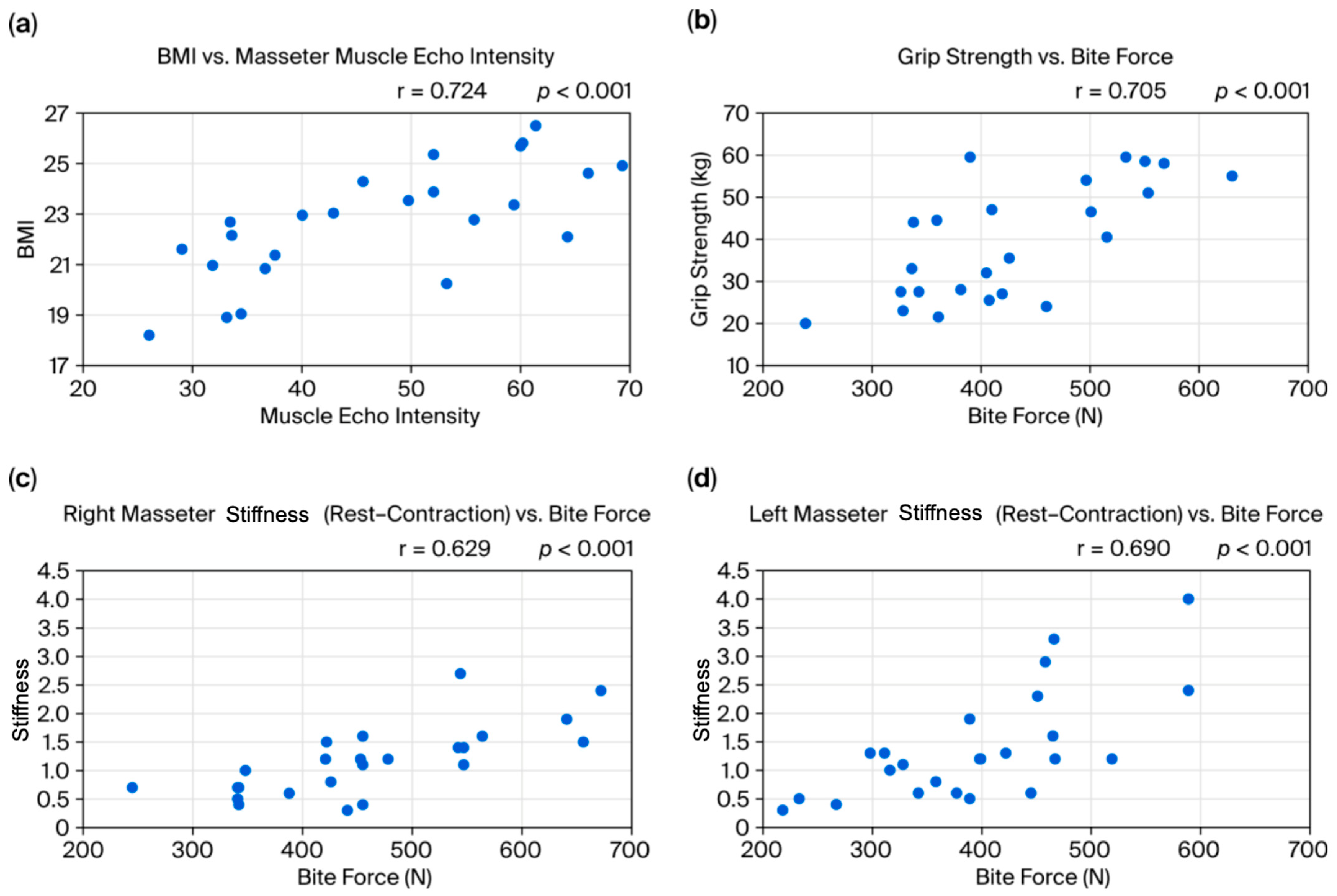 Figure 4. (a) Positive correlation between BMI and masseter muscle echo intensity. (b) Positive correlation between grip strength and bite force. (c) Positive correlation between right masseter stiffness ratio (rest–contraction) and bite force. (d) Positive correlation between left masseter stiffness ratio (rest–contraction) and bite force.