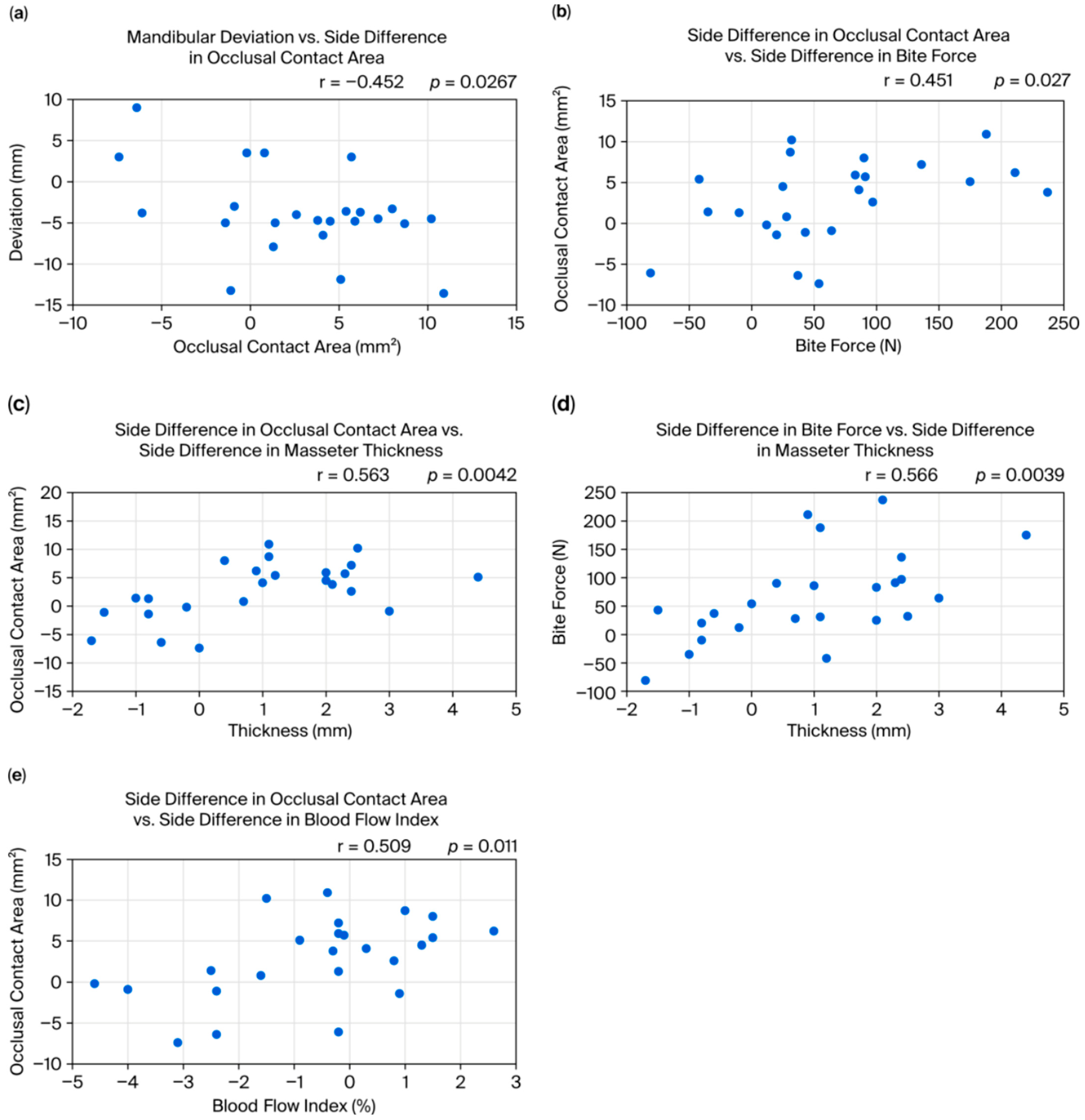 Figure 5. (a) Negative correlation between mandibular deviation and side difference in occlusal contact area. (b) Positive correlation between side difference in occlusal contact area and side difference in bite force. (c) Positive correlation between side difference in occlusal contact area and side difference in masseter thickness. (d) Positive correlation between side difference in bite force and side difference in masseter thickness. (e) Positive correlation between side difference in occlusal contact area and side difference in blood flow index.