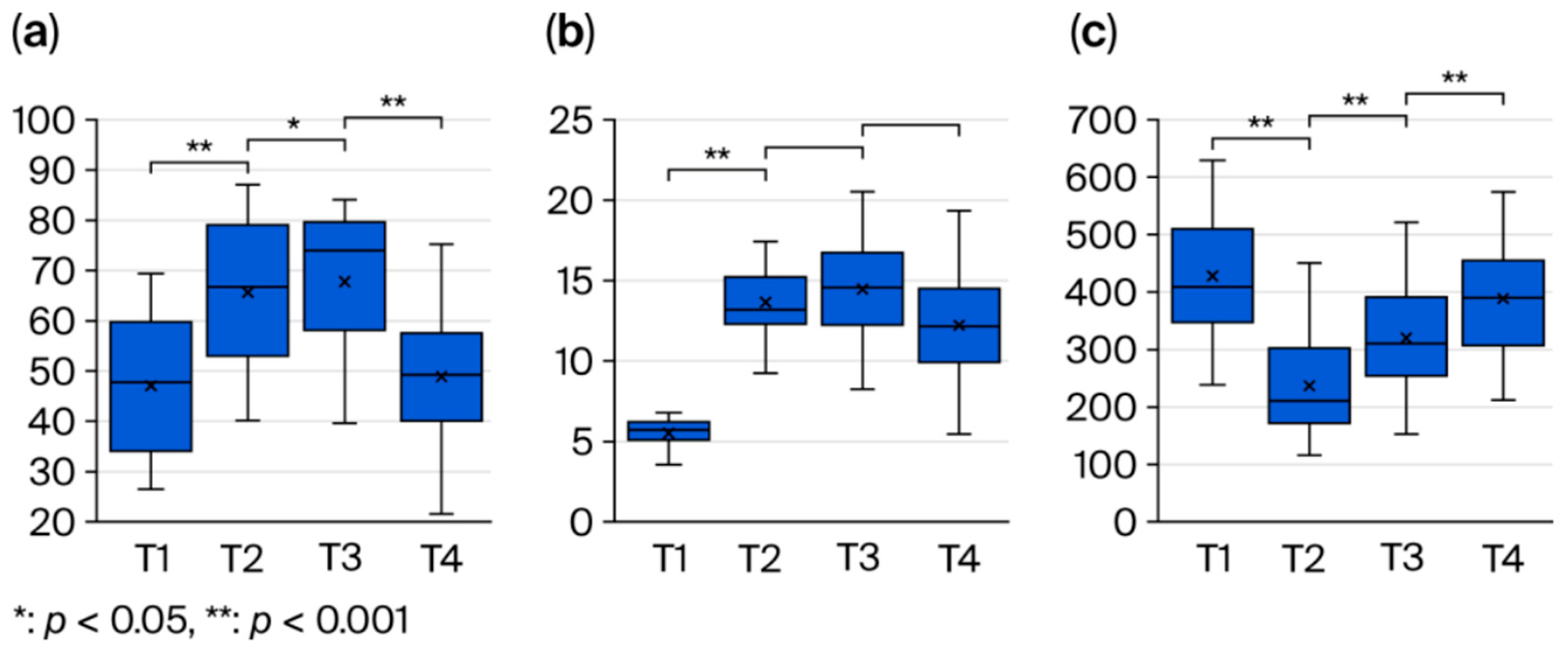 Figure 6. (a) Longitudinal changes in masseter muscle echo intensity (T1–T4). (b) Longitudinal changes in masseter blood flow index (T1–T4). (c) Longitudinal changes in bite force (T1–T4).