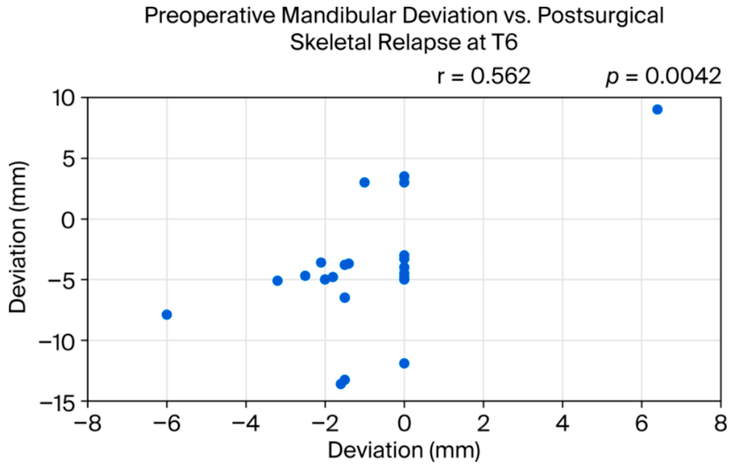 Figure 7. Positive correlation between preoperative mandibular deviation and postsurgical skeletal relapse at T6.