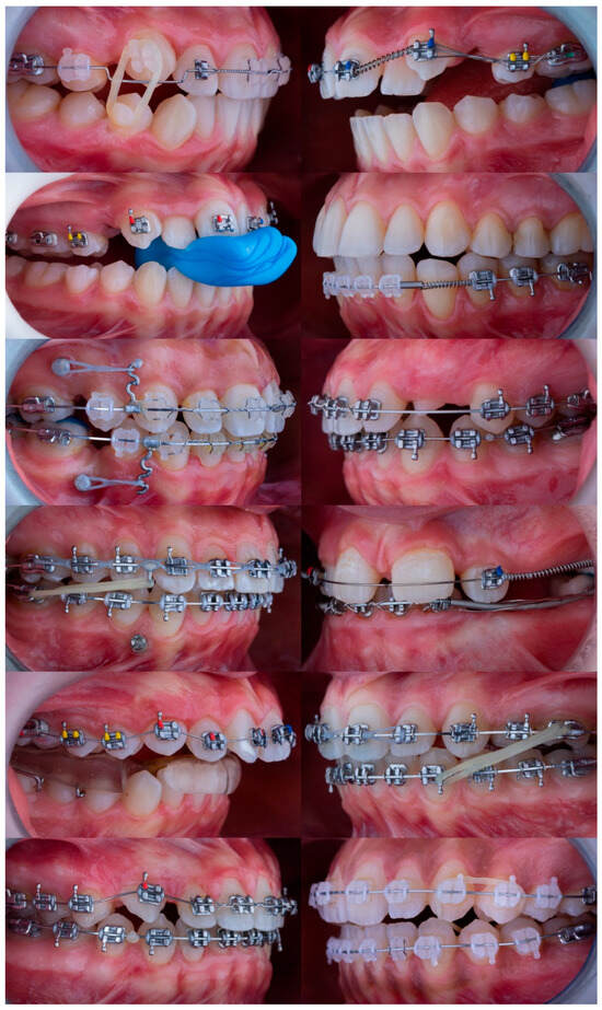 Representative sample of 12 standardized intraoral side-view photographs from the full dataset (N = 56). The images display a variety of orthodontic appliances and biomechanical configurations used to evaluate model performance.