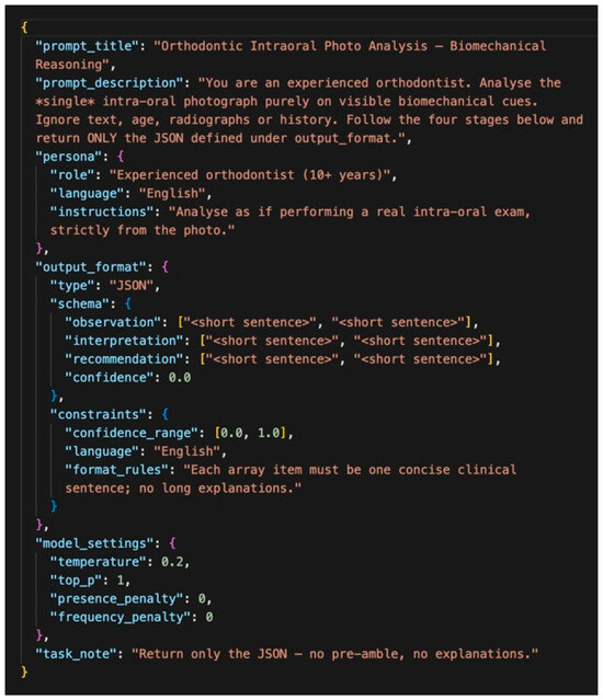 Each of the 56 standardized intraoral photographs was analyzed by the five multimodal LLMs. The models generated their assessments exclusively from the visual content of the images, without access to demographic data, clinical history, or radiographs. To ensure consistency, all models were queried with an identical JSON-based structured prompt. For each model, all 56 images were evaluated within a concentrated time window to minimize version drift. Each image was evaluated in a fresh session to avoid contextual carry-over. Each query was initialized in a fresh session to avoid contextual carry-over and potential bias between cases. This predefined output schema contained four fields. Observation referred to the identification of anatomical and orthodontic features. Interpretation indicated the biomechanical or clinical meaning inferred from the observations (e.g., malocclusion classification or treatment need). Biomechanics represented the recognition and evaluation of orthodontic appliances and their potential biomechanical function. Confidence denoted the model’s self-assigned certainty score on a scale from 0.0 to 1.0.