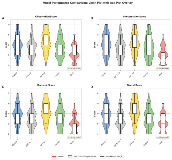 Comprehensive model performance comparison across all scoring dimensions. (A) ObservationScore, (B) InterpretationScore, (C) MechanicScore, and (D) OverallScore. Violin plots display the full distribution of expert ratings for each AI model, with overlaid box plots indicating the median (red line), interquartile range (white box), and whiskers extending to 1.5× the IQR. Individual outliers are shown as gray circles. The dashed horizontal line represents the midpoint (3.0) of the five-point Likert scale. Statistically significant differences were observed across all models (Kruskal–Wallis test, p < 0.001). n = 168 evaluations per model (56 images × 3 independent raters).