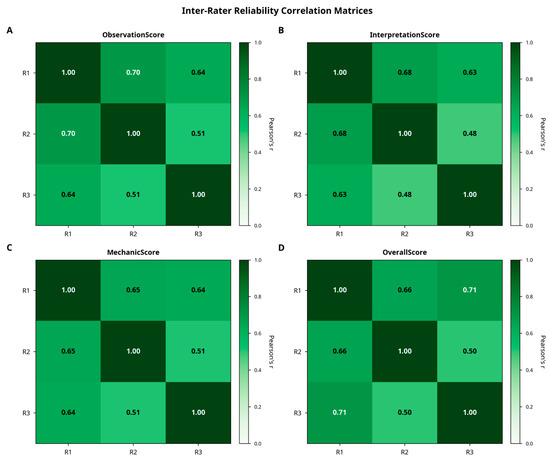 Inter-rater reliability correlation matrices. Heatmaps illustrate Spearman’s rank correlation coefficients between three independent raters for (A) ObservationScore, (B) InterpretationScore, (C) MechanicScore, and (D) OverallScore. All correlations were statistically significant (p < 0.001), indicating substantial agreement among raters across all scoring dimensions. Darker shades correspond to stronger correlations.
