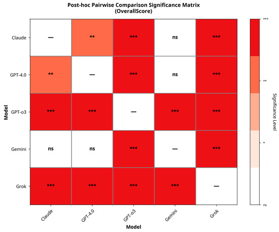 A Kruskal–Wallis test revealed statistically significant differences in composite performance scores among the five models (χ2 = 156, df = 4, p < 0.001). Post hoc analyses with the Dwass–Steel–Critchlow–Fligner method showed that GPT-o3 significantly outperformed all other models (p < 0.001), while Grok scored significantly lower than all comparators. Claude performed significantly better than GPT-4.0 and Grok (p = 0.001 and p < 0.001, respectively) but did not differ from Gemini (p = 0.146). GPT-4.0 and Gemini also showed no significant difference (p = 0.662). Pairwise significance patterns are visualized in Figure 7.