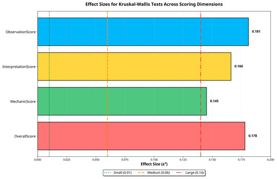 Effect sizes (ε2) derived from Kruskal–Wallis tests across scoring dimensions. All dimensions exhibit medium to large effect sizes, confirming substantial model performance differences.