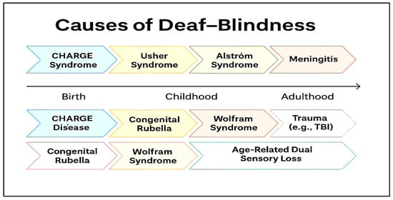 Other genetic syndromes that lead to combined vision and hearing loss include CHARGE, Alström, Wolfram, and Norrie diseases, each contributing to dual sensory impairment through distinct molecular mechanisms [,,]. Infections such as congenital rubella and cytomegalovirus (CMV) also remain significant causes, particularly in regions lacking widespread maternal vaccination or comprehensive prenatal screening programs [,]. Additional contributors include traumatic brain injury, peroxisomal and mitochondrial disorders, and, increasingly, age-related conditions such as presbycusis and macular degeneration [,,,,].