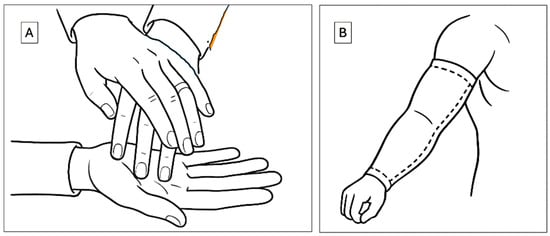 Haptic modes of communication. (A) Current method that employs hand touch (B) the method of this study that uses an arm sleeve for communication.