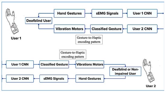 The overall communication architecture between two users of the technology introduced in this study is illustrated in Figure 4. As shown, the system enables communication between two individuals who are deaf-blind, or between a deaf-blind user and a non-impaired communication partner. The process begins when the first user performs a tactile or visual sign language gesture, such as a TSL or an ASL sign. The resulting muscle activations are recorded by surface electromyography (sEMG) sensors and classified to identify the performed gesture. This gesture is then mapped to a specific haptic feedback pattern, which is delivered to the second user through vibrotactile stimulation on the fingertips, enabling real-time, bidirectional communication.