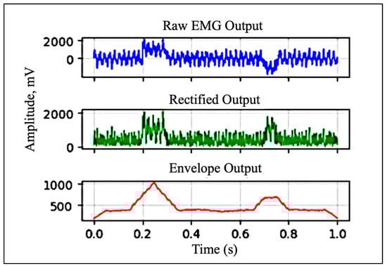 For envelope detection, the system uses a passive low-pass filter with a cutoff frequency of 3.6 Hz to smooth the rectified signal, capturing the overall shape and amplitude modulation of muscle activity. MyoWare sensors can output data in three formats: raw (RAW), rectified (RECT), or envelope (ENV). Since the envelope signal is the primary output of the sensor and is most suitable for gesture classification tasks, the ENV output was used in this study. Figure 5 illustrates the differences among these output formats and the role each plays in interpreting muscle activity.