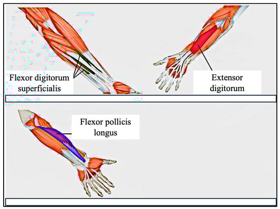 The human forearm and wrist contain over 20 muscles, many of which contribute to the fine motor control of the fingers []. These include both superficial muscles, such as the flexor digitorum superficialis (FDS), and deeper muscles, such as the abductor pollicis longus (APL). Due to the limitations of surface electrodes in capturing signals from deeper tissues, our system focuses primarily on superficial muscles to maximize signal quality and interpretability.