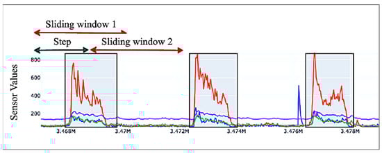 Sliding window mechanism shown on sample sEMG data from 4 sEMG sensors. Each color represents a sensor channel.