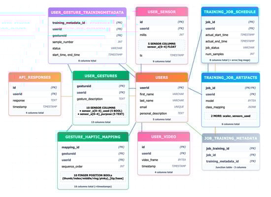 Once sensor data is received by the FastAPI endpoint, it is passed through the CNN model for real-time gesture inference. The resulting classification outputs are stored in a PostgreSQL database, alongside the original sensor data and relevant metadata for future retrieval and analysis. The system’s database schema will be detailed in a subsequent section.