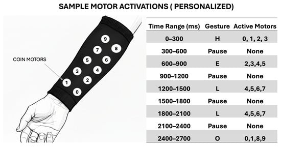 The signal processing unit amplifies the low-amplitude electrical signals generated by muscle fibers and filters out ambient noise to preserve signal integrity. These filtered signals are subsequently processed by the software interface, which employs real-time classification algorithms to interpret the user’s muscle activation patterns. Each recognized gesture is mapped to a unique sequence of vibration patterns, similar to the communication modality described in [], and transmitted to the wearable interface of the deaf-blind recipient, thereby effectively conveying the intended message. These mappings between gestures and vibration sequences are fully customizable, enabling support for various sign languages, dialects, or user-specific communication schemes. In scenarios involving communication between a deaf-blind individual and a sighted or hearing person, a computer can serve as the receiving and transmitting interface of the sighted or hearing person user’s end, allowing seamless bidirectional communication between users with different sensory profiles.