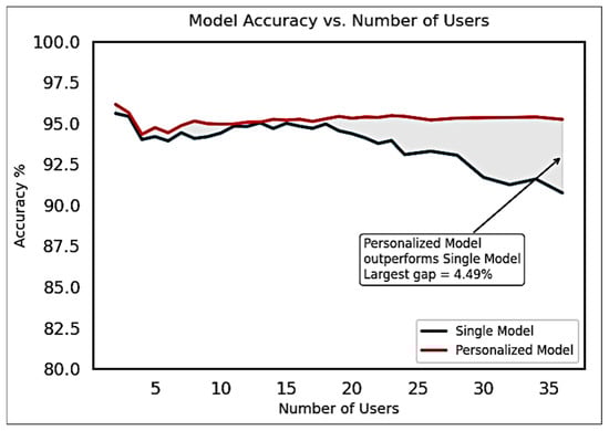 In this evaluation, model complexity, the number of training samples, and the number of training epochs were held constant to ensure a fair comparison. Results showed that personalized models consistently outperformed the cross-user model, particularly as the number of users increased. For every individual in the dataset, the personalized model achieved higher accuracy than the corresponding cross-user model.
