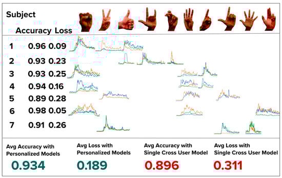 Map of each of the seven subjects and the unique hand gestures randomly chosen. Each hand gesture’s activation data is also shown with 3 channel sEMG data (green, orange, blue). The validation loss and accuracy is presented under each subject. Each personalized model’s validation accuracy is high than the cross-model accuracy.