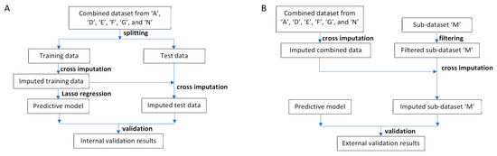 Data analysis workflow. (A) Workflow for model building and internal validation. First, the combined dataset was randomly split into training and test datasets. Cross-imputation was then conducted on the training data. Next, a predictive model was built using Lasso regression. Subsequently, cross-imputation was applied to the test data utilising the imputed training data. Finally, the model’s performance was evaluated. (B) Workflow for external validation. Initially, cross-imputation was performed on the combined dataset. Features exclusive to sub-dataset ‘M’ were omitted. Subsequently, cross-imputation was applied to the filtered sub-dataset ‘M’ using the imputed combined dataset. Finally, the predictive model’s performance was evaluated.