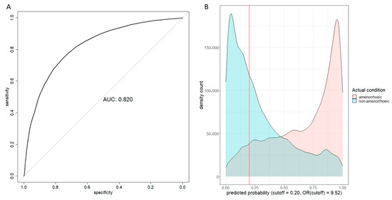 During internal validation, the AUC was 0.820 (95% CI: 0.817–0.823) (Figure 2A). Given the objective of prioritizing sensitivity over precision in predicting amenorrhea, the F score with β = 1.5 was maximised to derive a cutoff value of 0.20. As a result, the sensitivity reached 91.3% while precision stood at 61.7%. Figure 2B provides a clear visualisation, indicating that most patients experiencing amenorrhea at 12 months after treatment initiation fell to the right of the cutoff threshold. Details of the calibrated predicted risks can be found in Table 3.