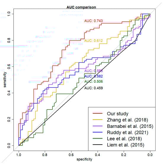 Exploratory AUC performance comparison for six models. The imputed external dataset was used for validation. The red curve was for our model. The other curves were for models built using the imputed combined dataset on the same associated variables and methods of previously published studies [40,46,49,52,55]. Differences in variable definitions and imputation mean these results are for contextual reference only.