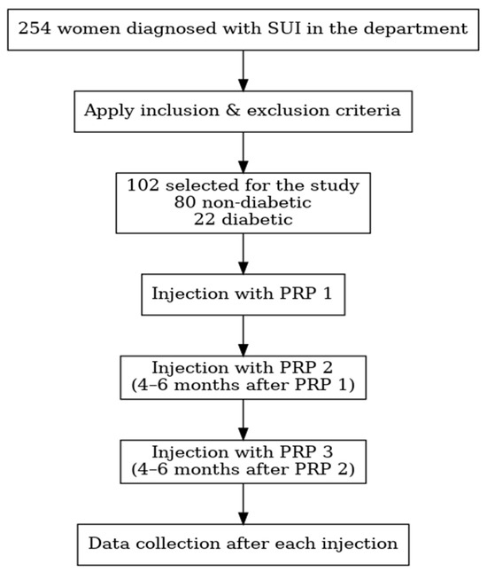 Steps of the study. Flowchart illustrating patient selection and study design. A total of 254 women diagnosed with stress urinary incontinence (SUI) were screened. After applying inclusion and exclusion criteria, 102 participants (80 non-diabetic and 22 diabetic) were enrolled. Each participant received three platelet-rich plasma (PRP) injections administered 4–6 months apart, with data collection performed after each injection. PRP: platelet-rich plasma; rpm: rotations per minute; SUI: stress urinary incontinence.